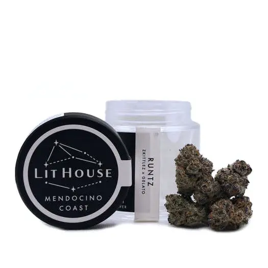 Zkittlez x Gelato The grass truly is greener in California and this red hot strain from the Cookies Fam is a shining example of Golden State excellence. Bred from two award-winning Cali classics, Zkittlez and Gelato, Runtz achieved instant celebrity status for its mouth-watering candy fruit flavor that is so tasty you just have to keep hitting it. A luscious tropical fruit aroma is highlighted with bright tangy citrus and rich earthy undertones. The high comes on smooth, with a simultaneous tingling, flowing body buzz and an active, inspired mental state, making Runtz an ideal functional creative strain. Like a soothing boardwalk evening, the thick Runtz buds are a deep indigo and viridian color, lit up with twinkling soft ember stigmas and stardust trichomes. Exhilarating yet tranquil, stimulating yet soothing, like the incomparable Pacific herself, Runtz captures all the greatness, glamour, and fertile magic of our beloved Golden Coast. Our LitHouse premium eighth jars contain 3.5 grams of small-batch, craft-grown, cannabis flower. LitHouse focuses on flavor and potency. All of our flowers is slow cold-cured and expertly trimmed for maximum terpene preservation. You can always count on high quality and consistency in every jar from LitHouse.